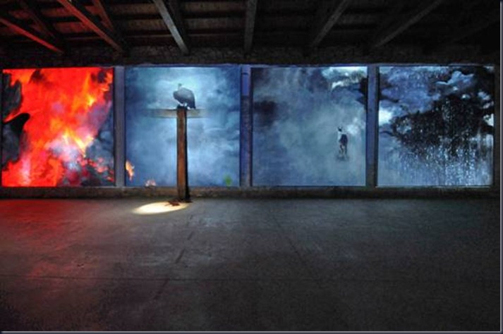 Then suddenly in 1986, he abandoned nature and turned to the mythologized human figure, in the sense of a Higher being with symbolic references to tragedy. In 1990 in France, he presented the installation Medea which was a faint video image projected onto huge painted areas, in the form of painting-performance. In 1997 came Artemis, in 2002, Angels of the Future, and in 2003 in Istanbul, the faded photographs of everyday, non-tragic “heroes”, who suddenly “came alive” with the use of a torch.